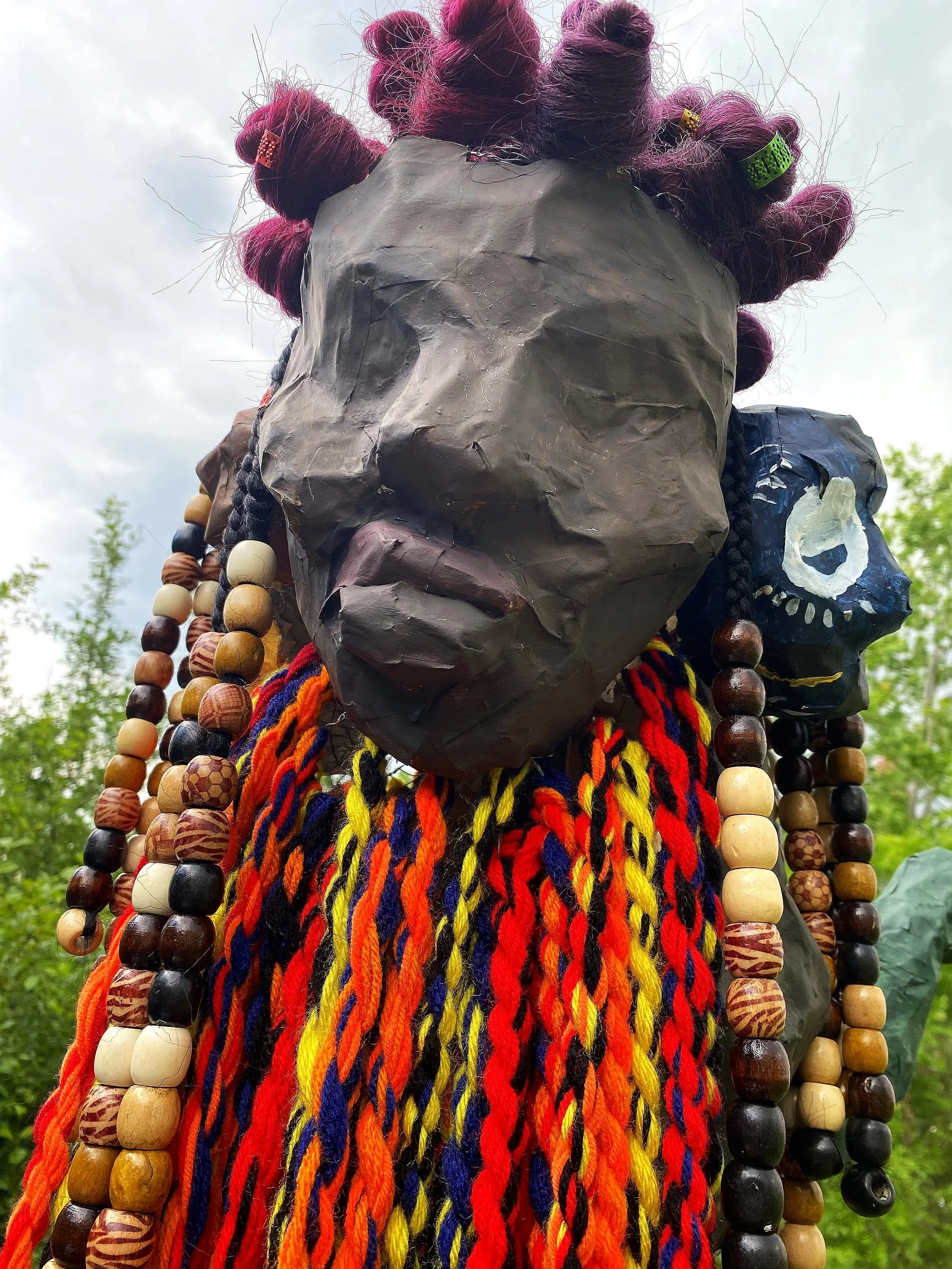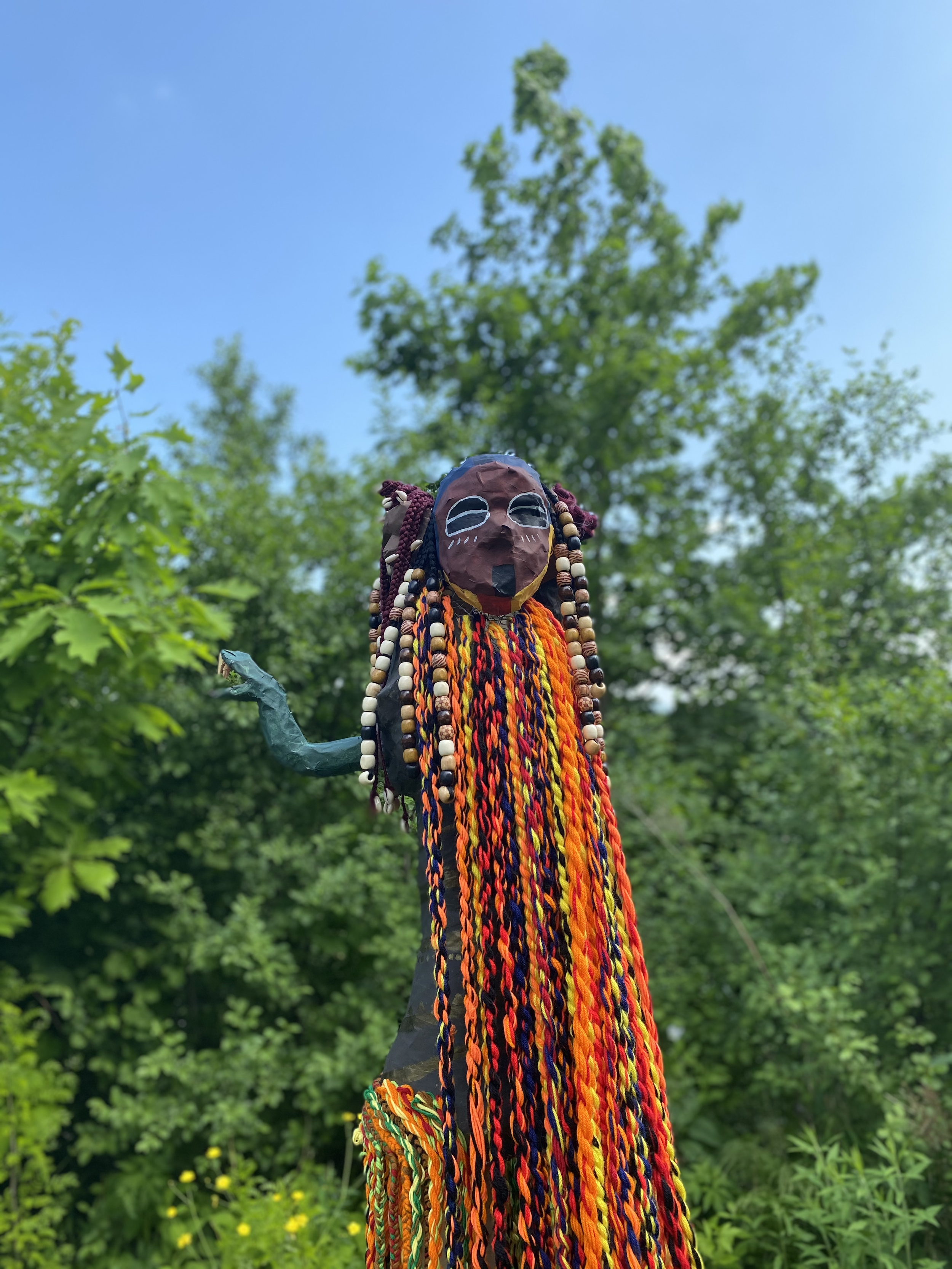 Their Eyes Were Watching Her chicken wire, wood, paper mache, acrylic paint, yarn, beads, kanekalon hair2021